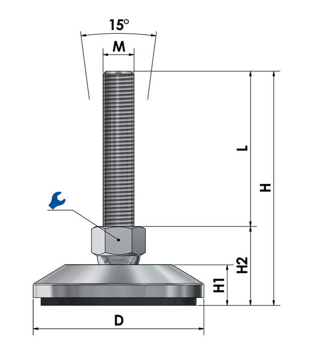 The machine foot is steplessly height-adjustable via the thread (depending on the spindle length) and can be adjusted to an angle of inclination of approx. 7.5° in each direction (approx. 15° in total) via the ball-bearing spindle. This guarantees stable and accurate alignment of the machine.