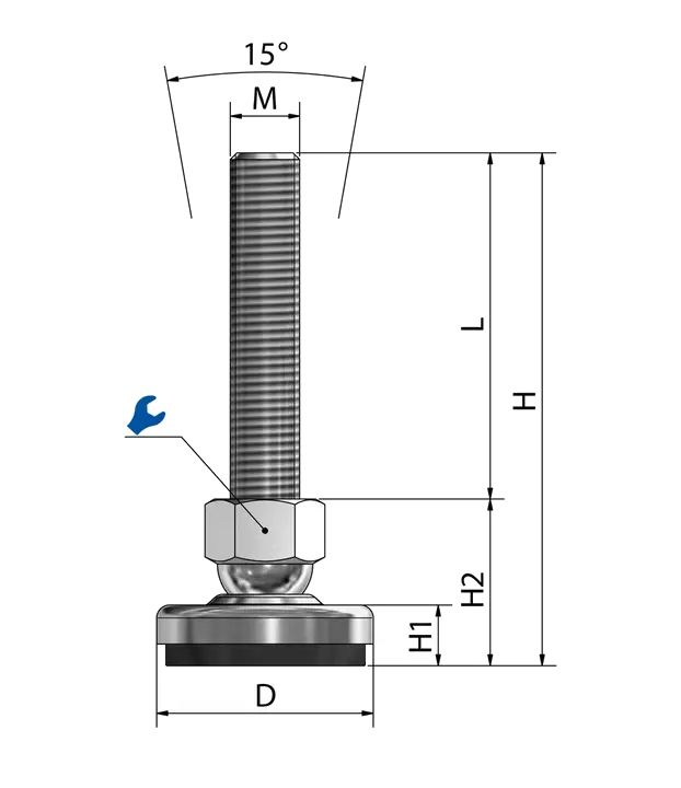 The machine foot is steplessly height-adjustable via the thread (depending on the spindle length) and can be adjusted to an angle of inclination of approx. 7.5° in each direction (approx. 15° in total) via the ball-bearing spindle. This guarantees stable and accurate alignment of the machine.