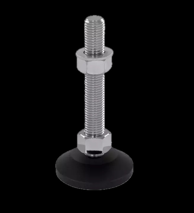 Der wartungsfreie Nivellierfuß bzw. Maschinenfuß ist stufenlos über das Gewinde höhenverstellbar (je nach Spindellänge) und bis zu einem gewissen Grad neigbar, was die präzise Montage und Ausrichtung vereinfacht.