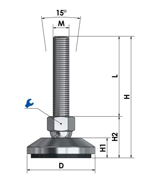O pé da máquina é ajustável em altura de forma contínua através da rosca (dependendo do comprimento do fuso) e, através do fuso com rolamento de esferas, num ângulo de inclinação de aproximadamente 7,5° em cada direção (aproximadamente 15° no total). Isto garante um alinhamento estável e preciso da máquina.